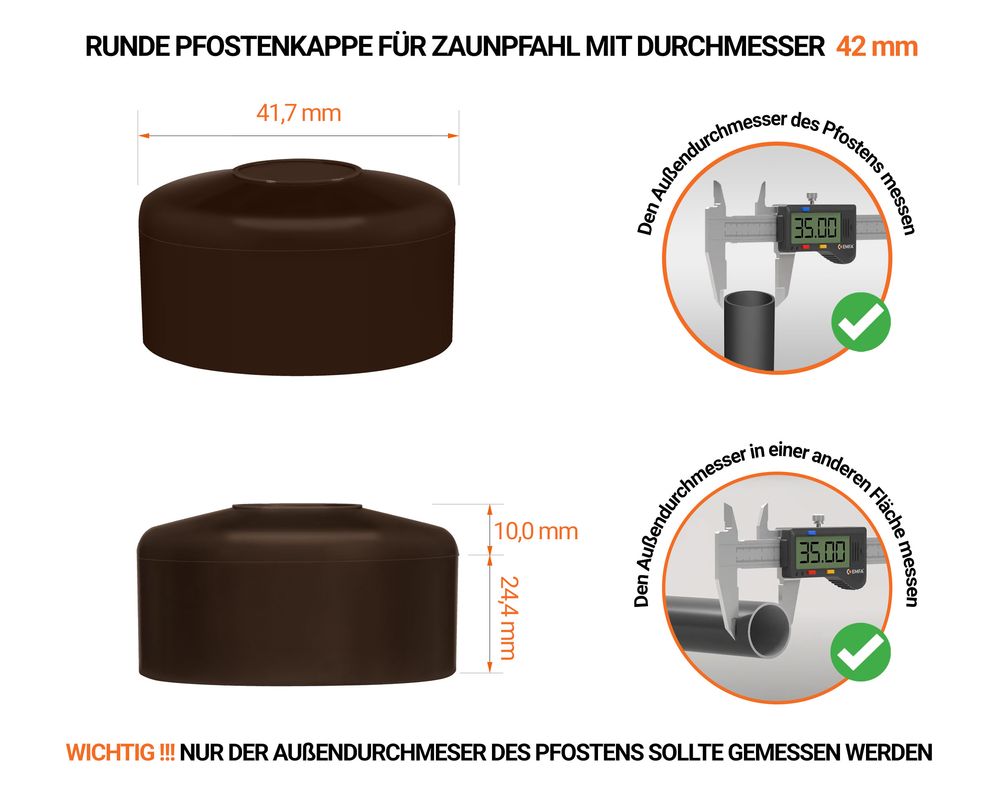 ● Embout pour poteau de clôture rond - diamètre 42 mm (4,2 cm). Bouchon fabriqué en polyethylene Marron (RAL 8028). Kit de 1 pièces.