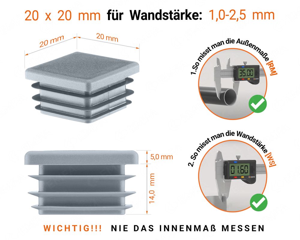 ● Rohrstopfen 20x20 mm aus Kunststoff - geeignet für die Wandstärke von 1,0 bis 2,5 mm - Farbe Grau. 25 Stück im Lieferumfang. 2x2 cm. Weitere Maße auf dem Bild.