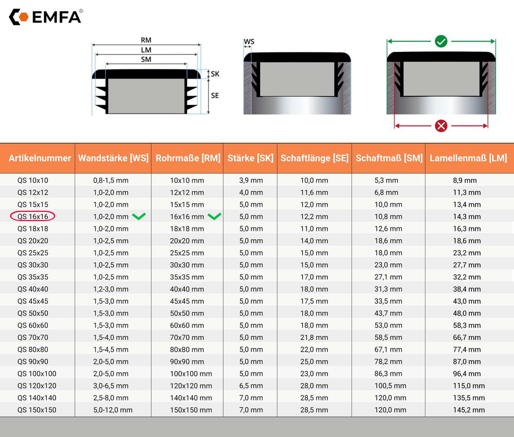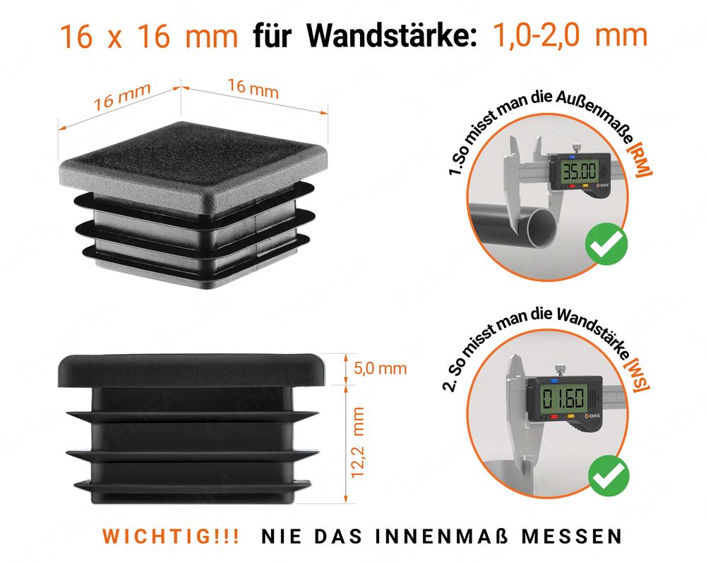 ● Rohrstopfen 16x16 mm aus Kunststoff - geeignet für die Wandstärke von 1,0 bis 2,0 mm - Farbe Schwarz. 5 Stück im Lieferumfang. 1,6x1,6 cm. Weitere Maße auf dem Bild.
