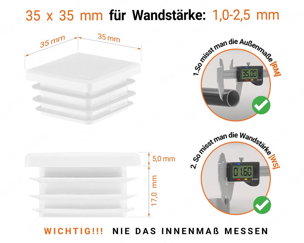 ● Rohrstopfen 35x35 mm aus Kunststoff - geeignet für die Wandstärke von 1,0 bis 2,5 mm - Farbe Weiß. 1 Stück im Lieferumfang. 3,5x3,5 cm. Weitere Maße auf dem Bild.