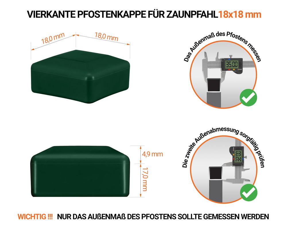 ● Pfostenkappen 1,8x1,8 cm in grün (RAL 6005) – Lieferumfang 10 Stück – für einen viereckigen Zaunpfosten mit den Abmessungen von 18x18 mm.