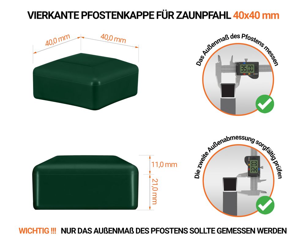 ● Pfostenkappen 4x4 cm in grün (RAL 6005) – Lieferumfang 100 Stück – für einen viereckigen Zaunpfosten mit den Abmessungen von 40x40 mm.